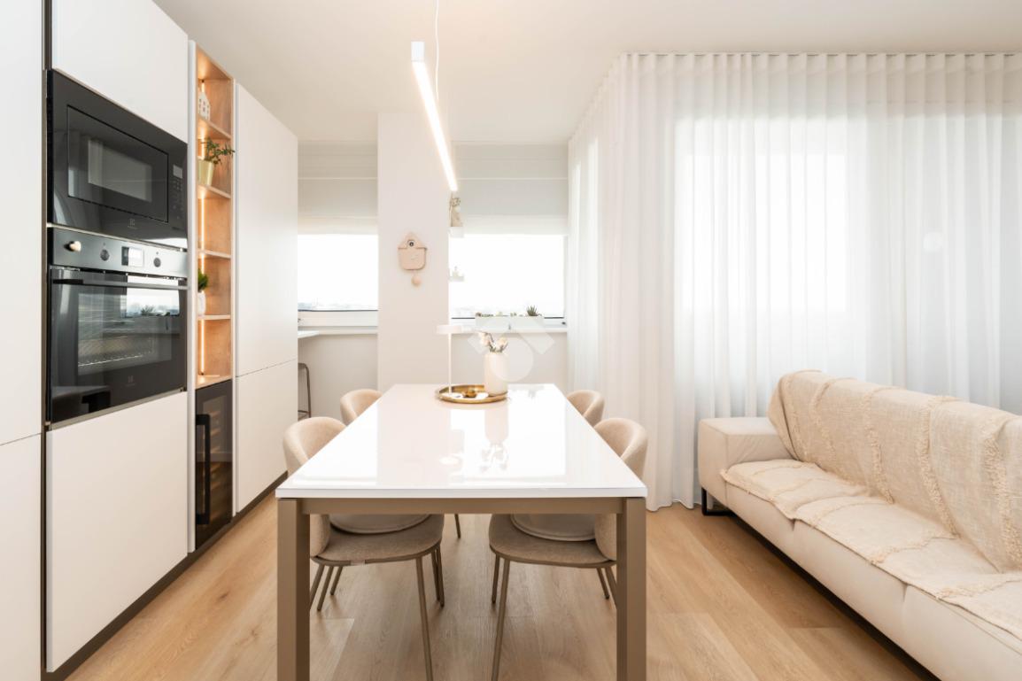 Gli spazi interni sono ulteriormente valorizzati dalla presenza di mobili realizzati su misura, studiati per ottimizzare ogni ambiente.